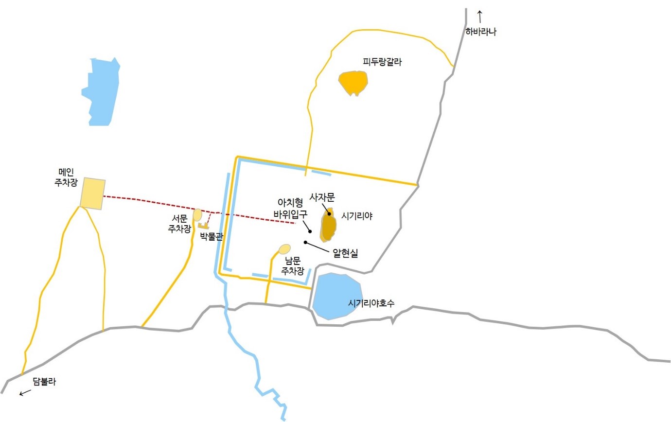 우리 일행이 시기리야 근처에 도착하자 저 멀리 거대한 몸체의 바위산이 모습을 드러냈다. 사자바위는 생긴 모습 때문에 바라보는 각도에 따라 다른 모양을 보여주었다. 우리는 서문주차장에서 차에서 내려 먼저 박물관으로 향했다. 외국인들은 보통 서문주차장을 통해 시기리야로 접근하게 된다. 외국인 입장권은 서문주차장 가까이에 있는 박물관에서 판매하기 때문이었다. (외국인 입장료는 1인당 $30이다.) 이 지점을 지나면 화장실을 사용할 수 없기 때문에 화장실 사용도 박물관을 찾아야 하는 중요한 과제 중 하나이다.