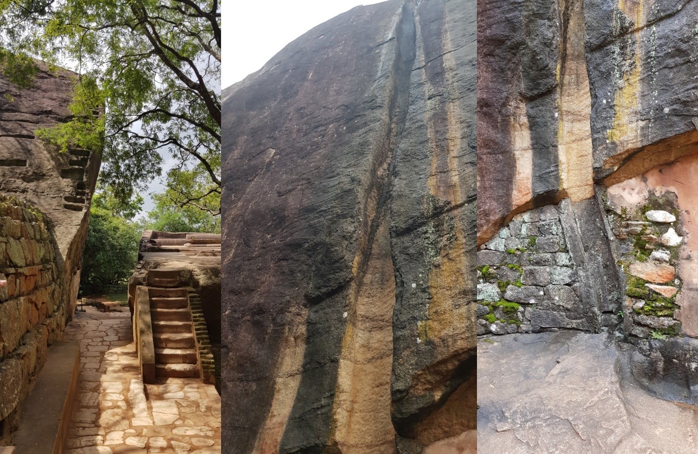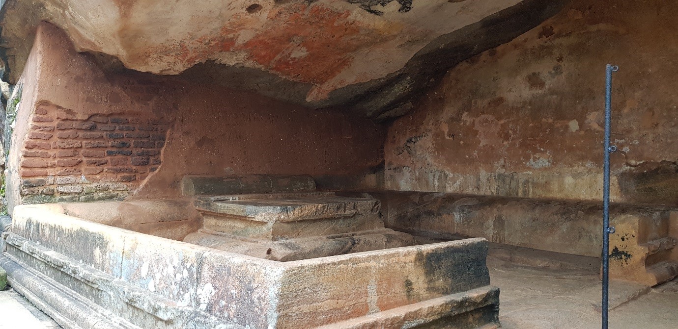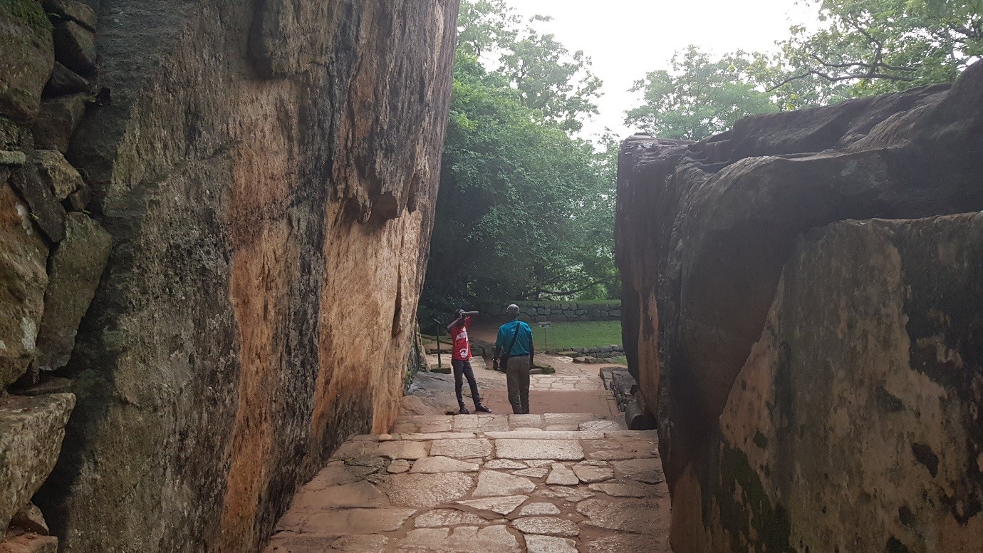 내려오는 길은 올라올 때보다는 좀더 빠르게 내려올 수 있었다. 사자바위 아래까지 내려와 남쪽 기단부의 바위정원에 이르면, 고대 스리랑카의 독특한 바위 건축물을 만나게 된다. 고대 바위 건축에서는 바위 위에 건물이나 정자를 짓고, 바위 아래 부분에는 벽화가 그려진 바위동굴이 있는 경우가 많다. 이러한 바위 건축의 대표적인 예가 알현실(Audience Hall)과 물탱크(Cistern) 바위이다.